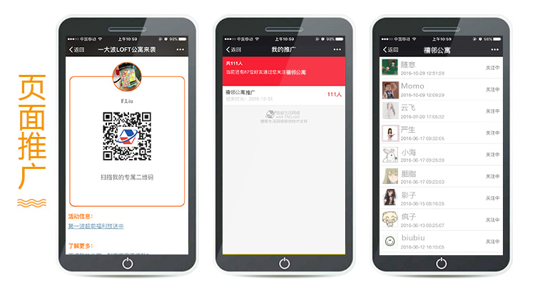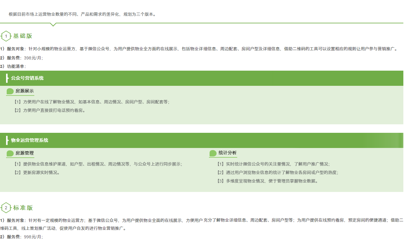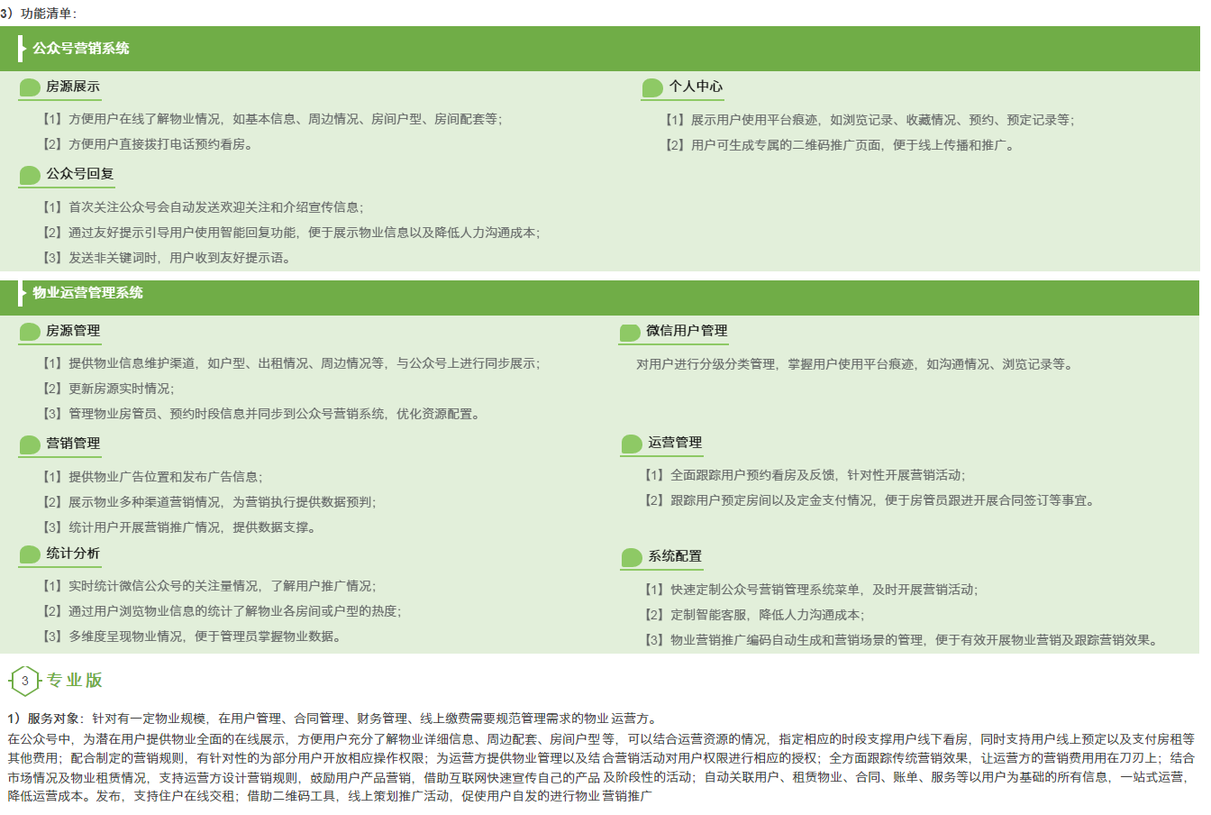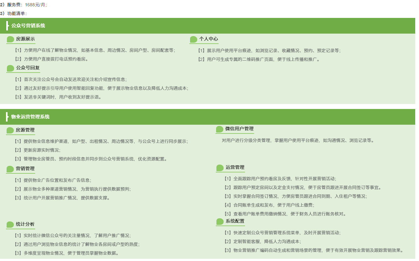 公众号营销系统为业内单身公寓、合租公寓提供多方位在线呈现方式,提升用户在线体验,尽可能展示出物业所有情况 。以微信公众号为载体,通过营销工具生成专属微信名片(二维码),利用营销内容有效刺激用户进行互联网传播,提升产品和品牌的知名度;同时对接物业运营管理系统,实时掌握关注用户使用平台痕迹,如访问足迹、预约情况、费用缴纳情况等。